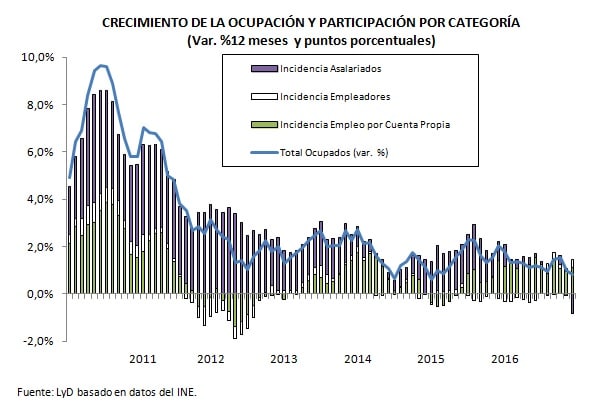 La expansión de la ocupación de 0,8% en 12 meses -la más baja desde comienzos de 2015- se explica por un positivo aumento de los empleadores de un 8,5% -con una incidencia de 0,3 puntos-; un empleo por cuenta propia que crece un 5,5% incidiendo 1,1 puntos, es decir, prácticamente la totalidad de la expansión de la ocupación; mientras que por su parte, el empleo asalariado se contrae un preocupante 1,2% con una incidencia de -0,8 puntos.