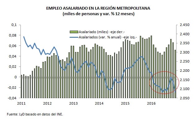 El Instituto Nacional de Estadísticas (INE) dio a conocer la tasa de desempleo correspondiente al trimestre noviembre 2016 - enero 2017, de un 6,2% a nivel nacional, cifra una décima mayor que el trimestre móvil pasado y tres décimas más alto que el mismo periodo de 2015-2016. Este nuevo resultado es algo peor de lo que adelantaba el mercado, que apuntaba más bien a una mantención, o baja marginal en línea con la estacionalidad de los meses de verano. La composición de los empleos que se están creando –como ha sido la lamentable tónica del año- sigue siendo preocupante, y de hecho se agrava, pues desde que existe la Nueva Encuesta Nacional de Empleo que no se observaba una contracción tan dramática del empleo asalariado a nivel país, situación que como hemos mencionado en el pasado es aún más evidente, y de más larga data, en la Región Metropolitana.