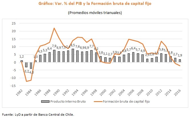 El Banco Central dio a conocer su más reciente estimación del PIB para 2016 además de reestimar los resultados correspondientes a 2014 y 2015[1]. En los tres años se observaron revisiones marginales en la tasa de variación del PIB, situándose ésta en 1,9%, 2,3% y 1,6%, respectivamente. Estos resultados no hacen más que confirmar la debilidad del crecimiento del producto en los últimos años. De hecho, el trienio 2014-2016 presenta la menor tasa de crecimiento en más de 30 años, de 1,9% promedio anual, solo superada -ampliamente- por la contracción del producto registrada tras la Crisis del 82’. Esto pese a que en estas últimas décadas Chile se vio enfrentado a eventos internacionales dramáticos como la Crisis Asiática y Subprime.