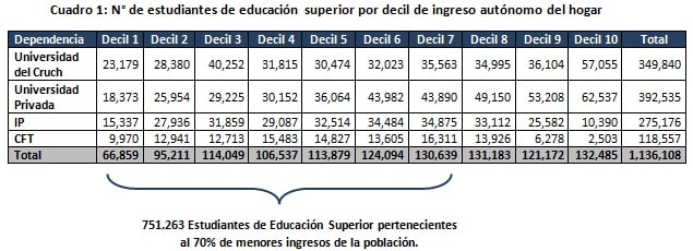 De acuerdo a los datos de la CASEN 2015 (último dato disponible), el número de estudiantes de educación superior pertenecientes al 70% de menores ingreso el año 2015 fue de 751.263 (ver Cuadro 1).