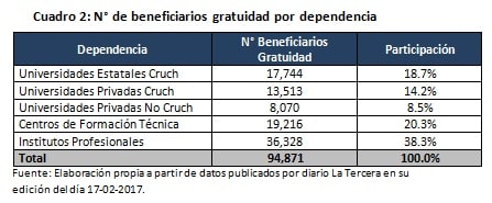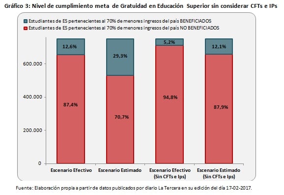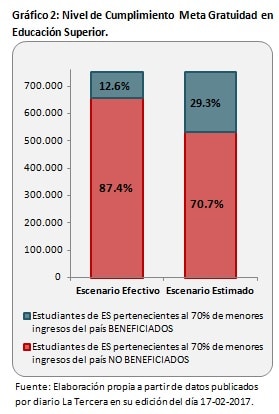 "Si suponemos que el número de estudiantes de educación superior pertenecientes al 70% de menores ingresos se ha mantenido constante desde el 2015 (supuesto conservador), entonces el nivel de cumplimiento de la meta sería de solo 12,6% si se consideran los 94.871 beneficiarios efectivos a la fecha y de 29,3% si se considera el número total de beneficiarios que el MINEDUC ha estimado que cubrirá la gratuidad durante el 2017", explica Cristina Tupper.