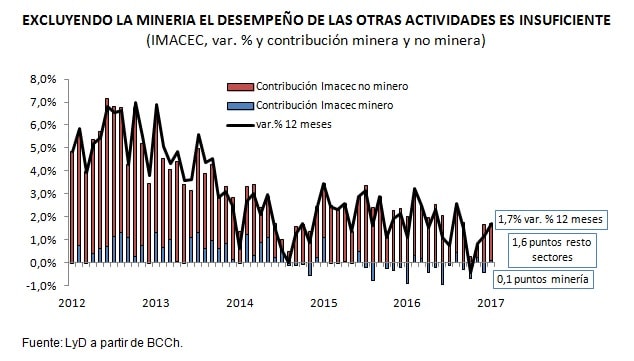 “Pese a que se superaron ampliamente las expectativas, sigue siendo un resultado bastante decepcionante, especialmente considerando el mejor desempeño del IMACEC Minero, que finalmente mostró un crecimiento de 0,9%, muy por encima de la contracción que el Indicador Sectorial del INE anticipaba", dice Francisco Klapp, investigador del Programa Económico de Libertad y Desarrollo. Lo anterior nos recuerda que la desaceleración de la actividad, y la incapacidad de repuntar, es un fenómeno que va mucho más allá de la actividad minera, y de hecho, la expansión de 1,8% experimentada por el producto no minero en enero es bastante similar a lo obtenido por este indicador en los meses previos. "Si bien se esperaba que el año 2017 fuera de menos a más en términos de crecimiento, el primer trimestre probablemente terminará siendo peor de lo esperado, con un febrero de contracción del IMACEC”, comenta Klapp.