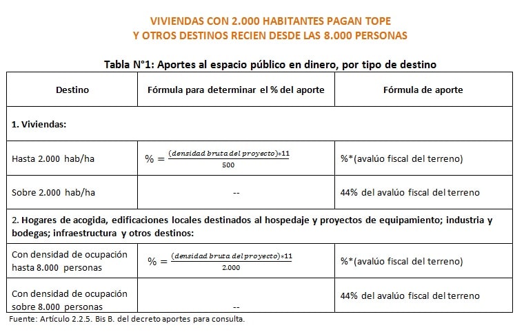 - Aportes al Espacio Público: para todos los proyectos que conlleven crecimiento por densificación deberán cumplir con lo dispuesto en el artículo 70 de la LGUC[2] o aportar de manera directa el valor monetario correspondiente al terreno a ceder. Alternativamente al pago en dinero, podrán materializar este aporte de la ejecución de estudios de prefactibilidad estipulados en el artículo 179 de la Ley.