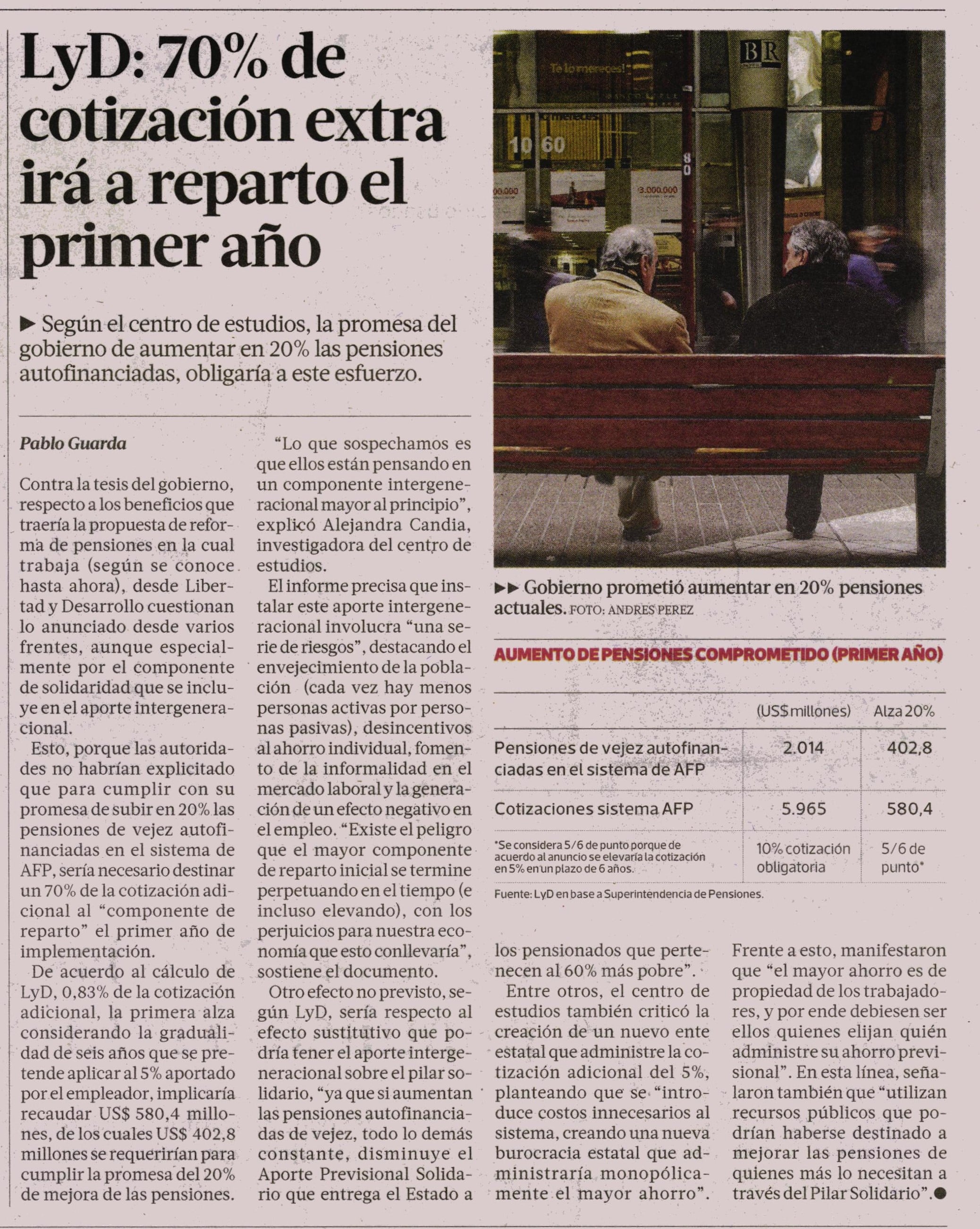 Otro efecto no previsto, según LyD, sería respecto al efecto sustitutivo que podría tener el aporte intergeneracional sobre el pilar solidario, 'ya que si aumentan las pensiones autofinanciadas de vejez, todo lo demás constante, disminuye el Aporte Previsional Solidario que entrega el Estado a los pensionados que pertenecen al 60% más pobre'.