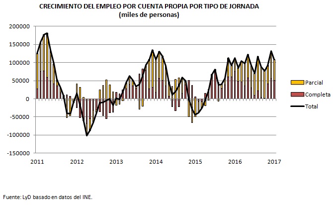 En concreto, la expansión de la ocupación de 1,4% en 12 meses se explica -al igual que en los trimestres anteriores- por un positivo aumento de los empleadores de un 15,2% -con una incidencia de 0,6 puntos-; un empleo por cuenta propia que crece un 6,6% incidiendo 1,3 puntos, es decir prácticamente la totalidad de la expansión de la ocupación; mientras que el empleo asalariado se contrae un 0,4% con una incidencia de -0,3 puntos.