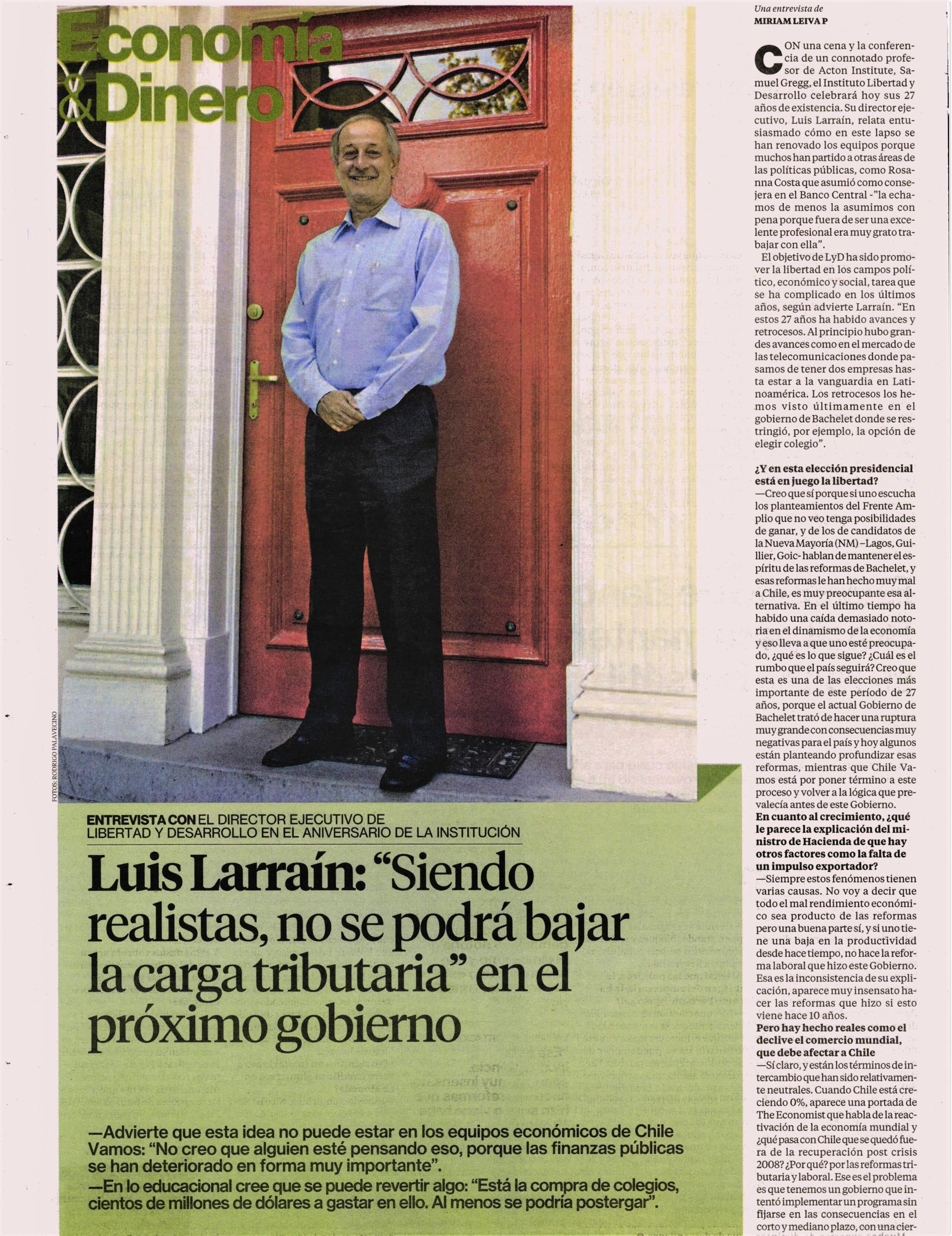 Con una cena y la conferencia de un connotado profesor de Acton Institute, Samuel Gregg, el Instituto Libertad y Desarrollo celebrará hoy sus 27 años de existencia. Su Director Ejecutivo, Luis Larraín, relata entusiasmado cómo en este lapso se han renovado los equipos porque muchos han partido a otras áreas de las políticas públicas, como Rosanna Costa que asumió como consejera en el Banco Central -”la echamos de menos la asumimos con pena porque fuera de ser una excelente profesional era muy grato trabajar con ella”.