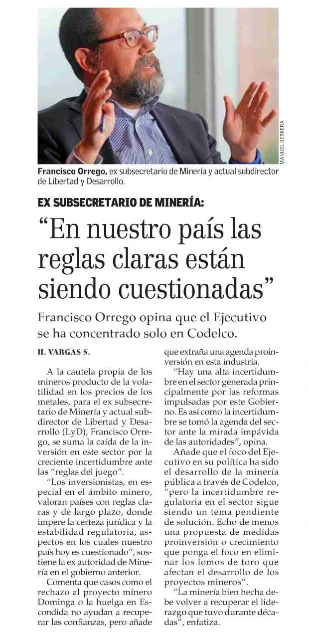 A la cautela propia de los mineros producto de la volatilidad en los precios de los metales, para el ex subsecretario de Minería y actual Subdirector de Libertad y Desarrollo (LyD), Francisco Orrego, se suma la caída de la inversión en este sector por la creciente incertidumbre ante las "reglas del juego".