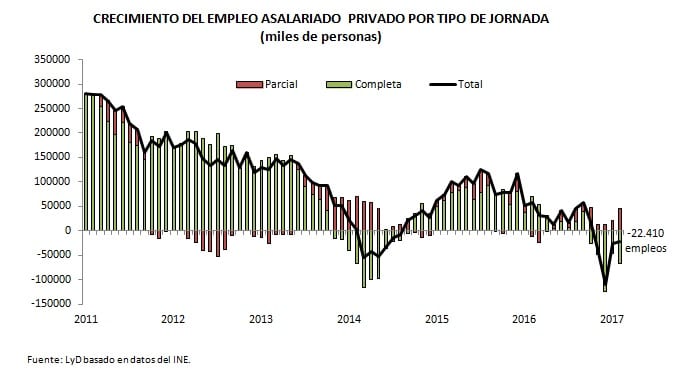 "Ahora estas mejoras en el margen, si bien son positivas, distan de ser suficientes para cambiar la situación actual, y también se observan algunas tendencias más negativas que matizan estos resultados", dice Klapp. Por ejemplo, el volumen total de horas trabajadas efectivamente en la economía se sigue contrayendo (-0,2% en doce meses), pues la expansión en el número de ocupados es insuficiente para compensar la caída en las horas promedio por trabajador; y si bien los asalariados totales se expanden, los asalariados del sector privado continúan contrayéndose en el neto, generándose además en esta categoría un reemplazo de empleo de jornada completa por jornada parcial.