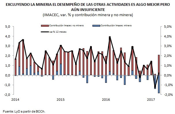 “Si bien se esperaba que el 2017 fuera de menos a más en materia de crecimiento, el primer trimestre ha resultado mucho más lento de lo anticipado, y tras el resultado de marzo, estimamos que la expansión en el primer cuarto del año fue de apenas un 0,1%", dice Klapp. Esto luego de que 2016 cerrará con un lento cuarto trimestre, de tan solo 0,5% de expansión interanual, alcanzándose así un escuálido 1,6% de crecimiento. Nótese además, que pese al relativamente mejor desempeño de los sectores no mineros en marzo (2,2% interanual) apenas si se alcanza una expansión de 1,3% en el resto de la economía en el primer trimestre. Lo anterior es un recordatorio de que la desaceleración de la actividad, y la incapacidad de repuntar, es un fenómeno que va mucho más allá de la actividad minera y fenómenos particulares como la paralización de Escondida.