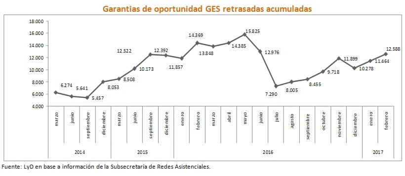 La lista de espera por patologías GES llega a 12.588 garantías de oportunidad retrasadas acumuladas a febrero de 2017, más del doble de los casos acumulados en marzo de 2014.