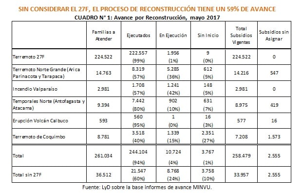 Se define avance del proceso de reconstrucción como la relación entre las soluciones habitacionales ejecutadas y el número de familias que deben ser atendidas por catástrofe. "Esta información es entregada por el gobierno, a través de los informes de avance a mayo del MINVU", explica Paulina Henoch, investigadora del Programa Social de LyD. En el Cuadro N° 1 se categorizan las distintas catástrofes por cantidad de familias damnificadas que deben ser atendidas por los programas del MINVU; los subsidios que ya han sido asignados, los ya ejecutados, en ejecución y los sin inicio.