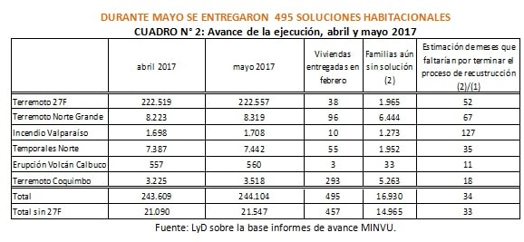Se observa en el Cuadro N° 1 que al considerar todas las catástrofes, en relación a las familias que se debe atender, un 93% de las viviendas han sido entregadas. Sin embargo, cuando se excluye el Terremoto 27F el avance sólo sería de un 59%. Esto se debe a que el terremoto 27F tiene un 99% de avance, mientras que el sismo en el Norte Grande presenta un 57% de avance; el incendio de Valparaíso un 57%; los temporales en el Norte un 80%; la erupción del Volcán Calbuco un 95%; y el terremoto de Coquimbo un 40%.