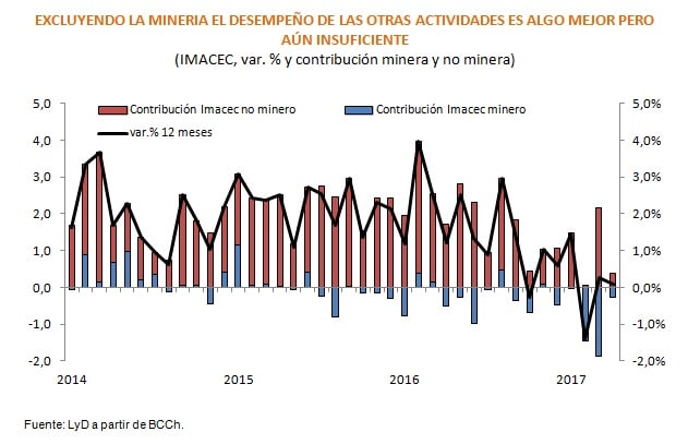 Ahora bien, durante estos meses han existido una serie de factores puntuales que explicarían parte de este pobre desempeño, como menos días hábiles, la paralización de Minera Escondida, y factores climáticos. "Sin embargo, incluso al corregir por estacionalidad y día hábiles, y mirando solo las actividades diferentes de la minería, vemos que en el año se acumula apenas un 1,6% de expansión –y 1,7% en los últimos 12 meses para esta misma medición-. Lo que es un claro recordatorio de que la desaceleración de la actividad y la incapacidad de repuntar es un fenómeno que va mucho más allá de la actividad minera y fenómenos particulares", dice Klapp.