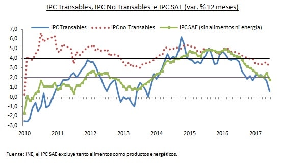Francisco Klapp, investigador del Programa Económico de LyD, explica que si bien la inflación resultó mucho menor de lo esperado (en torno a cero o levemente negativa), se aprecia que hay efectos puntuales, además de un dólar que en junio se cotizó en $665, esto es 1% menos que el mes anterior y 2,3% menos que en igual mes de 2016, lo que impacta a los transables. Adicionalmente, cuando se ven otros indicadores analíticos de la inflación, como la inflación de servicios, de la vivienda o de no transables en general, se da cuenta que si bien estos han tendido a ir a la baja, aún se encuentran en niveles cercanos, o incluso por sobre el 3% en términos interanuales.