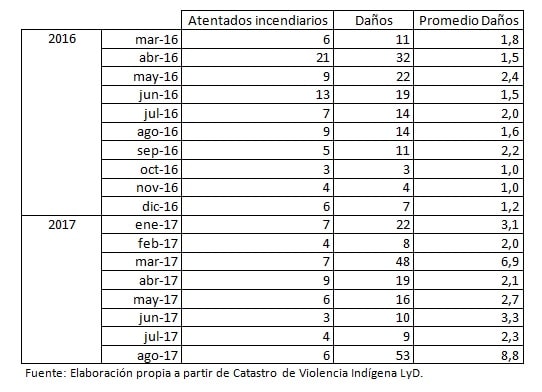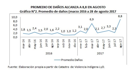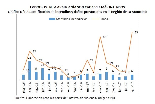 La escalada de violencia ha ido creciendo de forma exponencial, llegando al mayor nivel de violencia en los últimos tiempos durante agosto de 2017, donde la cantidad de objetos dañados llegó a 53 elementos. Comparado con agosto de 2016, los daños hanaumentado en un 378,5%. Se reconoce como daños la cantidad de objetos –camiones, iglesias, bodegas, etc- que fueron alcanzados por las llamas en cada uno de los atentados.