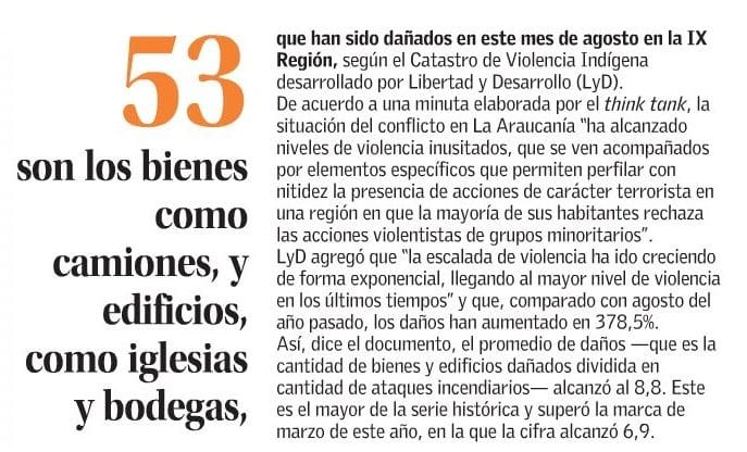 La situación del conflicto en La Araucanía ha alcanzado niveles de violencia inusitados, que se ven acompañados por elementos específicos que permiten perfilar con nitidez la presencia de acciones de carácter terrorista en una región en que la mayoría de sus habitantes rechaza las acciones violentistas de grupos minoritarios. La intensidad de las acciones recientes, tales como la destrucción de 29 camiones forestales en la región de Los Ríos por parte de encapuchados, ponen en relieve la gravedad del asunto.