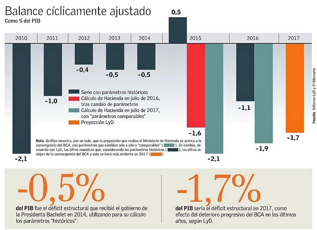 Es en este escenario donde Libertad y Desarrollo (LyD) elaboró un informe denominado "Presupuesto 2018 y Regla Fiscal", en el que el think tank asegura que, con la nueva forma de calcular el Balance Cíclicamente Ajustado (BCA) -tras ser modificada por el ministro Rodrigo Valdés en 2015-, no se consigue una convergencia al balance estructural.