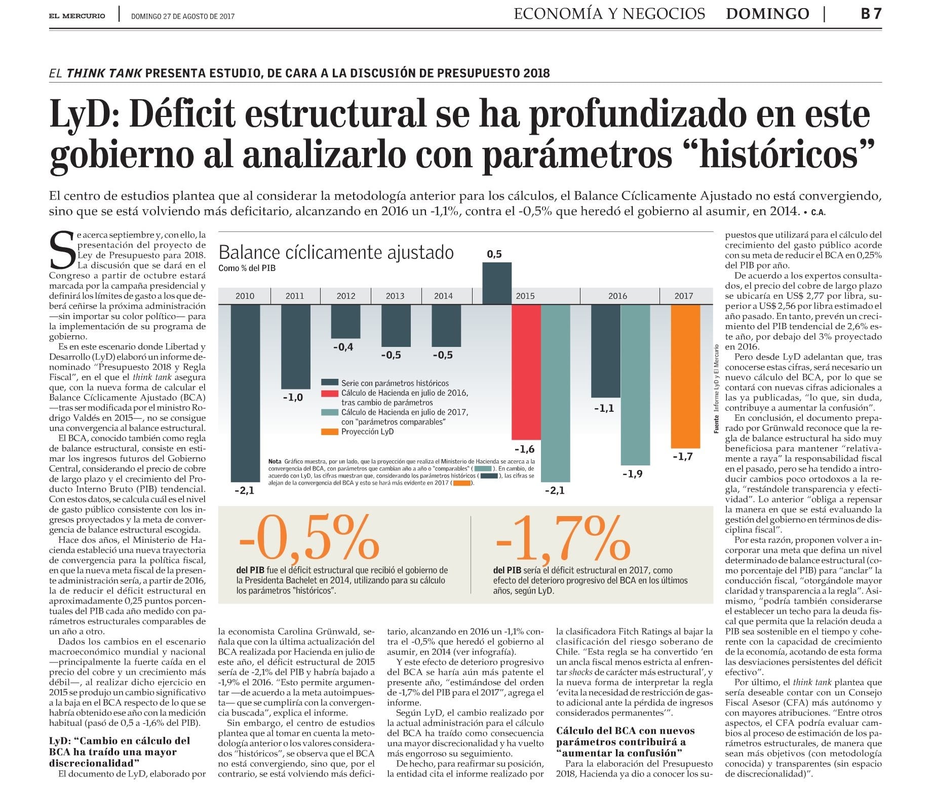 Es en este escenario donde Libertad y Desarrollo (LyD) elaboró un informe denominado "Presupuesto 2018 y Regla Fiscal", en el que el think tank asegura que, con la nueva forma de calcular el Balance Cíclicamente Ajustado (BCA) -tras ser modificada por el ministro Rodrigo Valdés en 2015-, no se consigue una convergencia al balance estructural.