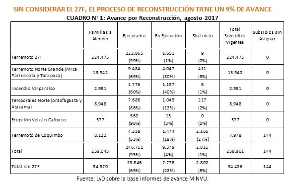 Se observa en este cuadro que al considerar todas las catástrofes, en relación a las familias que se debe atender, un 95% de las viviendas han sido entregadas. "Sin embargo, cuando se excluye el Terremoto 27F el avance sólo sería de un 69%", asegura Paulina Henoch, investigadora del Programa Social de LyD. Esto se debe a que el terremoto 27F tiene un 99% de avance, mientras que el sismo en el Norte Grande presenta un 69% de avance; el incendio de Valparaíso un 60%; los temporales en el Norte un 86%; la erupción del Volcán Calbuco un 98%; y el terremoto de Coquimbo un 53%.