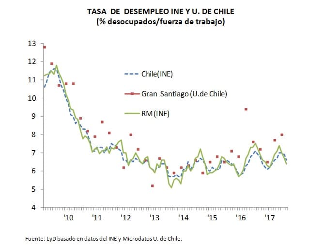 El Instituto Nacional de Estadísticas (INE) dio a conocer la tasa de desocupación nacional correspondiente al trimestre junio - agosto de 2017, de un 6,6% a nivel nacional (6,9% el trimestre móvil anterior), con lo que se concreta, en términos anuales, una disminución de 0,3 pp. Esta nueva disminución anual en la tasa de desempleo, fue resultado de del incremento de los Ocupados (2,3%) por sobre el de la Fuerza de Trabajo (2,1%).