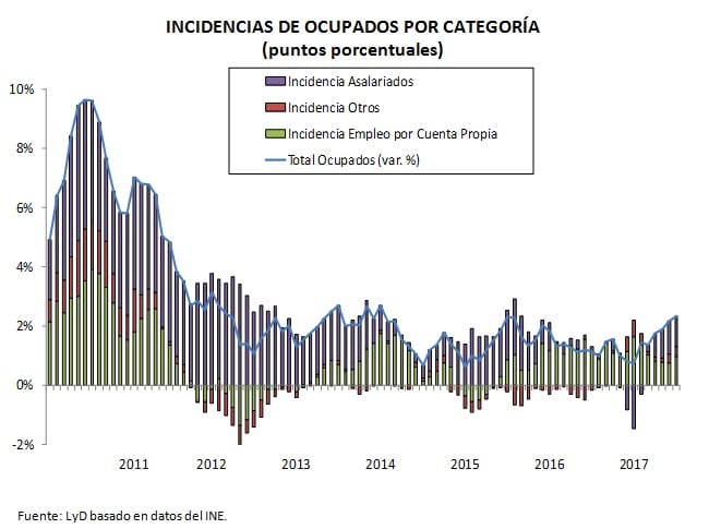 Por el lado de la composición de los ocupados, su expansión se explica por un positivo aumento de los empleadores de un 9,2% (13,0% el período anterior), un empleo por cuenta propia que vuelve a crecer: 4,5% (3,5% el período previo) y un empleo asalariado que vuelve a reducir su tasa de expansión, alcanzando esta vez un e expande un 1,5% (1,6% el período previo).