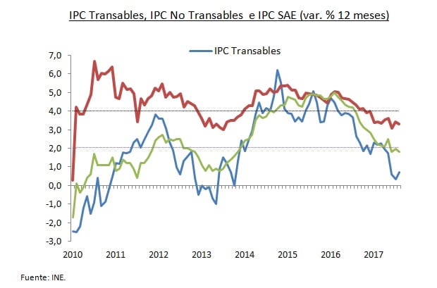 El Instituto Nacional de Estadísticas (INE) dio a conocer el Índice de Precios al Consumidor (IPC) para el mes de agosto 2017, el cual registró una variación mensual de 0,2%, cifra por debajo las expectativas de mercado. En términos anuales, la inflación total alcanzó una variación de 1,9%, ubicándose por tercer mes consecutivo bajo el piso del rango de tolerancia. Las medidas subyacentes (IPCX e IPCX1), en tanto, traspasaron el piso del rango de tolerancia con una tasa de crecimiento anual de 1,9%.