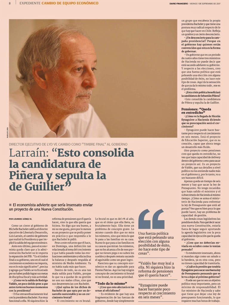Como un cierre al gobierno de Michelle Bachelet califica el Director ejecutivo de Libertad y Desarrollo, Luis Larraín, el cambio de gabinete que realizó la Presidenta y que implicó la salida del equipo económico. Ante esto último, para el economista queda claro que a la administración Bachelet no le importa la expansión del PIB. "Es el timbre final a su gobierno, uno en el cual el crecimiento económico no importa, eso es lo más significativo", precisa y agrega que Valdés se va frustrado por no haber podido lograr sus metas de disciplina fiscal y más actividad.