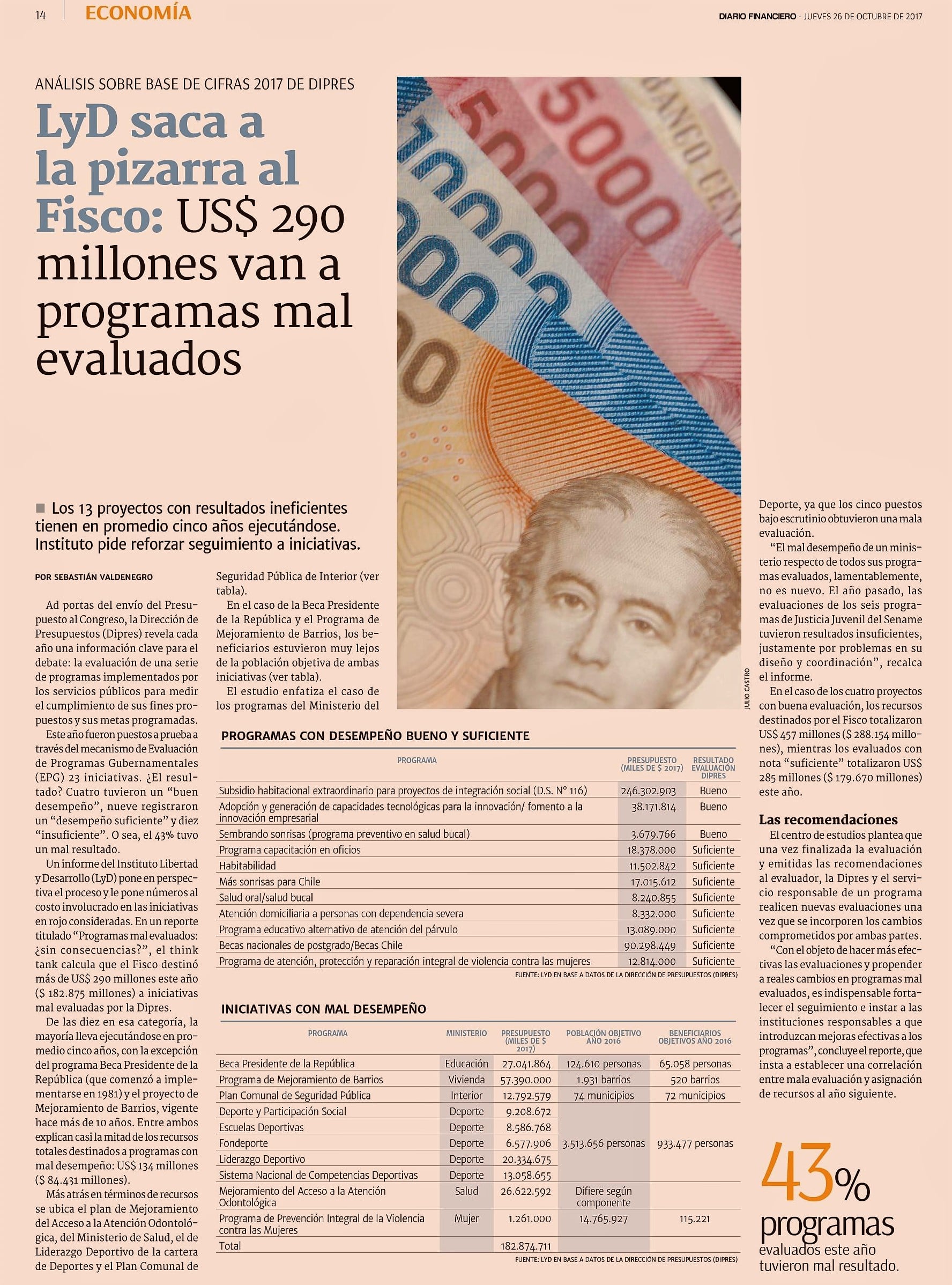 Un informe de Libertad y Desarrollo (LyD) pone en perspectiva el proceso y le pone números al costo involucrado en las iniciativas en rojo consideradas. En un reporte titulado 'Programas mal evaluados: ¿sin consecuencias? (ver estudio aquí)', el think tank calcula que el Fisco destinó más de US$ 290 millones este año ($ 182.875 millones) a iniciativas mal evaluadas por la Dipres.