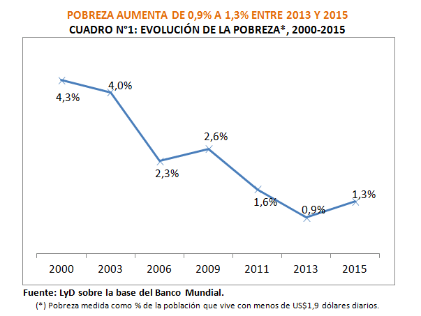 Pero más grave aún es que Chile venía bajando de manera significativa su tasa de pobreza, según la metodología del Banco Mundial, de 8,5% a 0,9% entre 1987 y 2013. Por esta razón, el alza a 1,3% en el año 2015 resulta lamentable. "Esto podría ser un reflejo que durante los últimos años se han llevado a cabo ciertas reformas que han reducido la capacidad de crecer y con ello han afectado variables tan relevantes como el empleo formal, herramienta clave a la hora de reducir la pobreza. Y si bien nos han hecho creer que no afectarían a la población más vulnerable de nuestro país, estas cifras nos alertan que sí podrían tener algo de efecto", explica la Investigadora del Programa Social de LyD, Paulina Henoch.