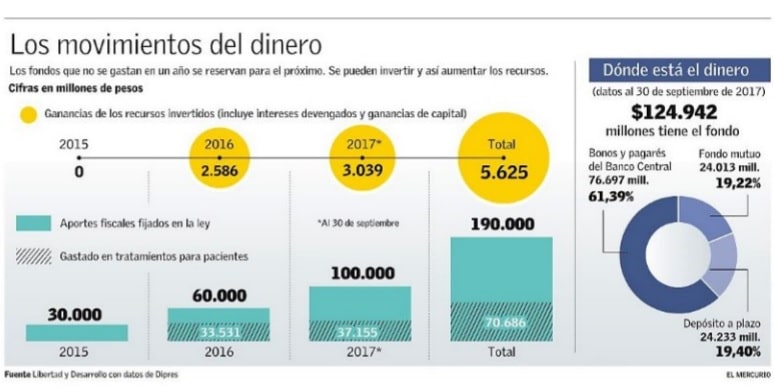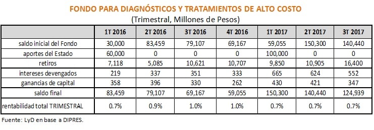 "Con todo, un análisis a los reportes del Fondo que entrega la DIPRES desde el primer trimestre de 2016 nos lleva a concluir que desde su creación el Fondo ha recibido aportes estatales por $190.000 millones", señala Alejandra Candia. De ellos, $70.686 millones han sido retirados en el tiempo para financiar los tratamientos establecidos en un decreto supremo conjunto del MINSAL y el Ministerio de Hacienda. El resto ha sido invertido, generando dividendos por $3.081 millones en intereses devengados y $2.544 millones por ganancias de capital, esto es un total de $5.625 millones de ganancias. Estas ganancias equivalen a una rentabilidad promedio trimestral de 0,7% sobre los aportes netos de los retiros.