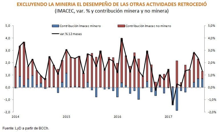 "De esta forma, y tras este nuevo resultado, se requeriría de una expansión promedio de al menos 2,75% en términos interanuales en lo que queda del año para alcanzar el 1,5% de crecimiento anual para el 2017, que utiliza el Ministerio de Hacienda en sus proyecciones", señala la Economista Senior de LyD, Carolina Grünwald.