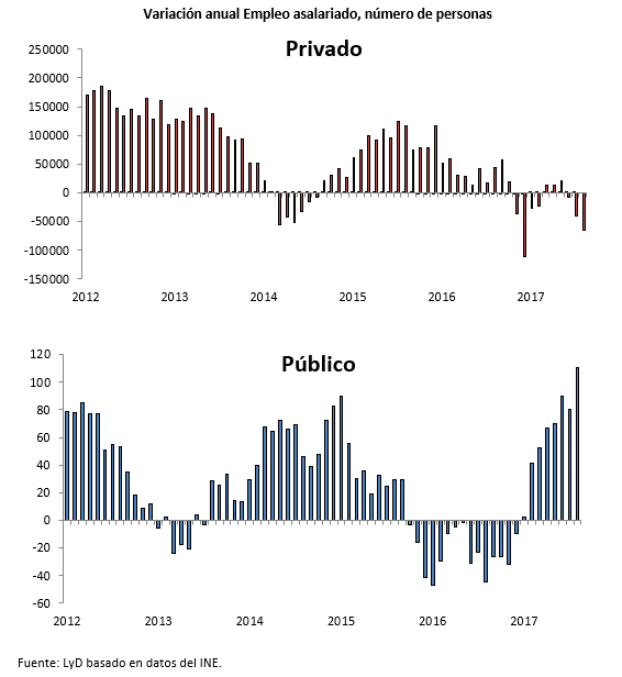 Dentro de los asalariados, en tanto, nuevamente aumentaron los públicos y disminuyeron los privados, en términos anuales. Los primeros registraron un incremento de 12,6% (110.282 empleos), al tiempo que los segundos disminuyeron nuevamente, esta vez 1,4%, algo más de 64.000 empleos. "De esta manera se tiene que más de la mitad del empleo asalariado del sector público compensa la destrucción del empleo asalariado del sector privado", explica Carolina Grünwald, Economista Senior de Libertad y Desarrollo..