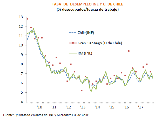 El Instituto Nacional de Estadísticas (INE) dio a conocer la tasa de desocupación nacional correspondiente al trimestre septiembre - noviembre de 2017, de un 6,5% a nivel nacional (6,7% el trimestre móvil anterior), con lo que se concreta, en términos anuales, un aumento de 0,3 pp. "Esta alza anual en la tasa de desempleo, fue resultado del incremento de los Ocupados (2,1%) por debajo del de la Fuerza de Trabajo (2,4%), a la vez que los desocupados aumentaron 6,2%, dando mayor presión al mercado laboral", indica la Economista Senior de Libertad y Desarrollo, Carolina Grünwald.