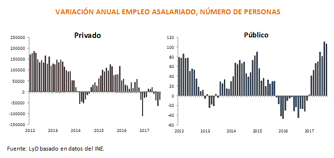 Por el lado de la composición de los ocupados, su expansión se explica principalmente por un positivo aumento de los trabajadores por Cuenta Propia (4,5%) y Asalariados (1,3%). "Dentro de los asalariados, en tanto, nuevamente aumentaron los públicos y disminuyeron los privados, en términos anuales", cuenta Grünwald. Los primeros registraron un incremento de 12% (106.518 empleos), al tiempo que los segundos disminuyeron 0,7%, 35.517 empleos. "De esta manera, se tiene que el aumento de empleo asalariado público sigue siendo históricamente alto y alcanza a compensar con creces la destrucción del empleo asalariado del sector privado", asegura la economista.