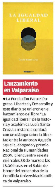 "Ha sido una maravilla para mí. He recibido muchos comentarios lo que me ha hecho pensar que valió la pena por ser un punto de vista distinto. Traté de ser intelectualmente honesta y no de escribir un panfleto", dice la historiadora y Consejera de Libertad y Desarrollo, Lucía Santa Cruz, acerca de su último libro "La igualdad liberal" que presentó por primera vez en noviembre y que hoy será lanzado en Valparaíso, ya con una segunda edición que ingresó a imprenta en enero.