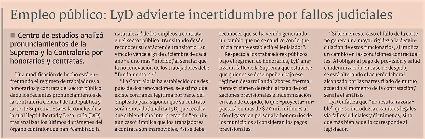 Respecto a los trabajadores públicos bajo el régimen de honorarios, LyD analiza un fallo de la Suprema que establece que quienes se desempeñen bajo ese régimen desarrollando labores 'permanentes' tienen derecho al pago de cotizaciones previsionales e indemnización en caso de despido, lo que impactará en más de $40 mil millones al año el gasto en personal a honorarios de los municipios si consideran los pagos previsionales.