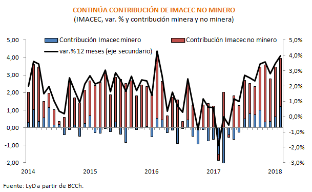 De esta manera, las contribuciones al IMACEC de febrero 2018 fueron de 1,2 por el lado de la minería (el doble del mes anterior) y de 2,8 por el lado de la actividad no minera (igual al mes previo), la cual fue influida principalmente los sectores comercio y servicios.