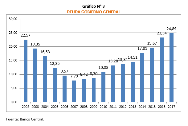 El ritmo de incremento de la deuda de gobierno ha sido bastante alto, alcanzando un 24,9% del PIB al 2017. "Si bien el nivel no es una deuda demasiado alta respecto a otros países, es la rapidez de su incremento lo que preocupa, siendo un argumento central para la rebaja en la nota en la clasificación de la deuda soberana el año pasado", dice la economista.