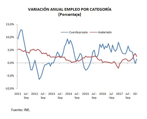 En términos generales, y según lo esperado, pese a que se observa un aumento en la tasa de desempleo total, por categoría ocupacional vuelve a aumentar la tasa de crecimiento anual de los asalariados, esta vez en 2,6% (3,8% el trimestre móvil anterior). En tanto, los empleados por cuenta propia registraron un crecimiento de 1,5% anual, por debajo del incremento promedio del 2017 (de 4,7%).