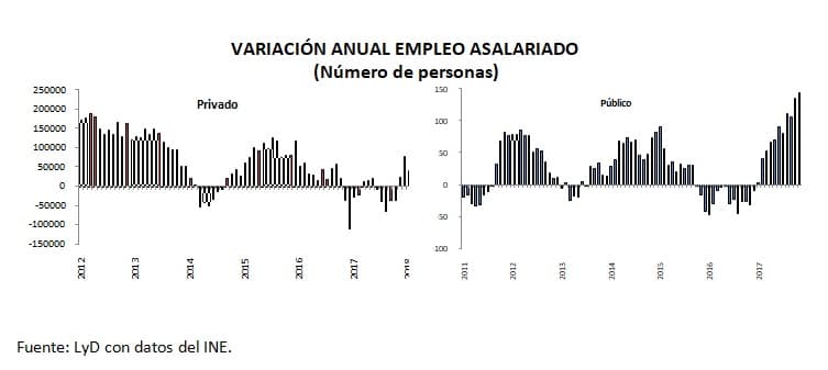Dentro de los asalariados, en tanto, se registró una nueva alza en los empleos asalariados privados, sumando 39.739 empleos, esto es, un alza anual de 0,8% (1,6% el trimestre móvil anterior). Sin embargo, continúa dominando el lado de los empleos asalariados públicos, los que volvieron a registrar un incremento, aunque menor al del trimestre móvil anterior. Esta vez de fue de 12,8% anual, lo que significa 109.655 empleos (135.817 el registro previo).