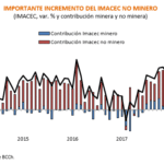 Si desagregamos el IMACEC entre Minero y no minero, se tiene que el primero aumentó 6,9%, al tiempo que el IMACEC no minero creció 4,7%. Corrigiendo por estacionalidad y días hábiles, el IMACEC minero aumentó 3,3% respecto del mes anterior y el IMACEC no minero aumentó 0,5%.