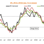 Por su parte, el índice de precios de los transables no registró variación mensual (significando una variación anual de 2%), mientras que el de los no transables varió 0,2% en el mes y 3,2% en doce meses. Finalmente, se observa que el IPC sin alimentos ni energía (IPCSAE) registró una variación mensual de -0,1% (1,9 % en doce meses).