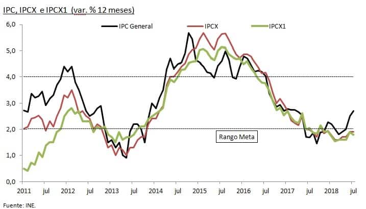 El Instituto Nacional de Estadísticas (INE) dio a conocer el Índice de Precios al Consumidor (IPC) para el mes de julio 2018, el cual registró una variación mensual de 0,4%, cifra por sobre las expectativas de mercado. En términos anuales, la inflación total alcanzó una variación de 2,7%.