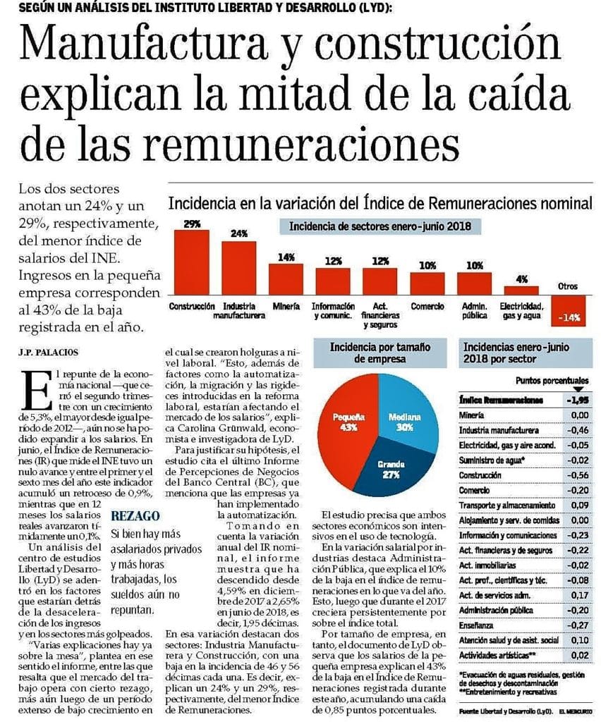 Esto, luego que durante el 2017 creciera persistentemente por sobre el índice total. Por tamaño de empresa, en tanto, el documento de LyD observa que los salarios de la pequeña empresa explican el 43% de la baja en el Índice de Remuneraciones registrada durante este año, acumulando una caída de 0,85 puntos porcentuales.