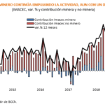 De esta manera, las contribuciones al IMACEC de noviembre 2018 fueron de 0,8 por el lado de la minería y de 2,3 por el lado de la actividad no minera, la cual fue influida principalmente el sector servicios.