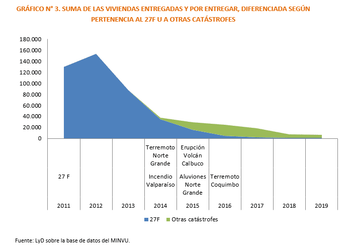 En el Gráfico N° 3 se muestra la suma de las viviendas por entregar y entregadas, descomponiendo el total entre las pertenecientes al 27F y a otras catástrofes. Como se puede ver, gran parte de esta composición corresponde a causas distintas al Terremoto del 2010, mostrándose un gran avance en la reducción.