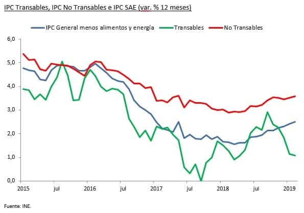 Por su parte, el índice de precios de los transables varió -0,1% en febrero, significando una variación anual de 1,1%, mientras que el de los no transables registró variación mensual de 0,3%, alcanzando un 3,6% en doce meses. Finalmente, se observa que el IPC sin alimentos ni energía (IPCSAE) registró una variación mensual de 0,3%, alcanzando una variación anual de 2,5%.