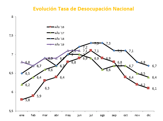 El Instituto Nacional de Estadísticas (INE) dio a conocer la tasa de desocupación nacional correspondiente al trimestre abril-junio 2019, el cual se ubicó en 7,1% a nivel nacional, igual a la del trimestre móvil anterior. En doce meses, a su vez, hay una leve reducción de 0,1 puntos porcentuales. Este resultado es más bajo de lo esperado por el mercado, en donde la estimación bordeaba el 7,2%.