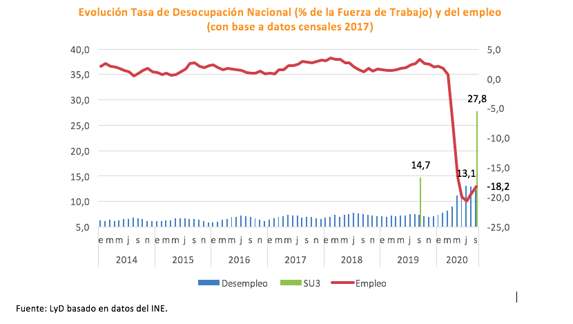 El Instituto Nacional de Estadísticas (INE) dio a conocer la tasa de desocupación nacional correspondiente al trimestre julio-septiembre 2020, la cual se ubicó en 12,3%, 0,6 puntos porcentuales (pp) menor a lo registrado el trimestre móvil anterior. En doce meses, en tanto, se observa un incremento de 5,0 puntos porcentuales. Este resultado se ubicó en línea con las expectativas del mercado. Adicionalmente se registró una leve disminución en la tasa combinada de desocupación y fuerza de trabajo potencial con respecto al trimestre móvil anterior, la que se ubicó en 27,8%.