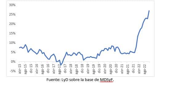 Hace una semana, el Ministerio de Desarrollo Social y Familia (MDSF) dio a conocer el valor a noviembre de 2022 de la canasta básica de alimentos (CBA). Su variación anual llegó a su mayor valor: un 27% desde el año 2015 (Gráfico 1).